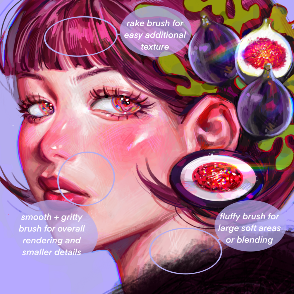 you can use these for a variety of painting styles; for everyday painting brushes or textured blenders, I have been incorporating these brushes into my recent artworks, my favorite being the rake brush that I use in most of my work!